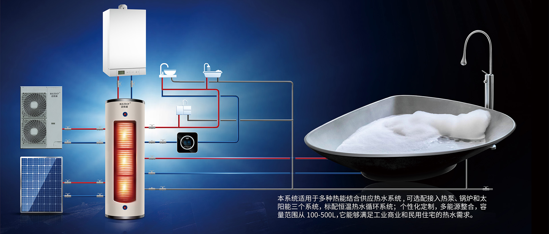 邁熱浦中國工廠致力于銅盤管承壓水箱、平板太陽能系統及空氣源熱泵的水箱設計生產;在生命歷程中,邁熱浦中國太陽能熱水箱、熱泵熱水箱、鍋爐換熱水箱、地暖供暖配件等領域走過新的生命歷程,解決數萬家庭熱水系統方案,目前我司把太陽能、熱泵和天然氣鍋爐良好的結合,讓太陽能技術廣泛應用于生活熱水與地板采暖,改善人類對美好生活的需求,追求更優(yōu)越的品質生活。